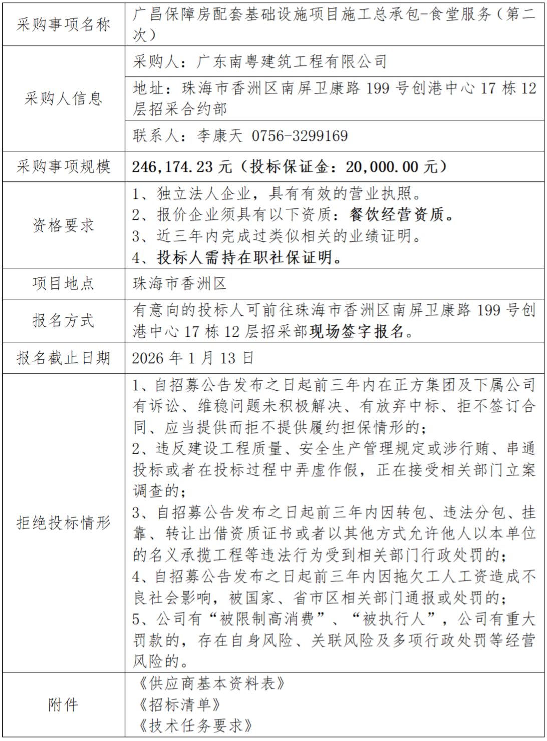 廣昌保障房配套基礎(chǔ)設(shè)施項目施工總承包-食堂服務(wù)(第二次) 專欄:工程招標(biāo) 發(fā)布日期: 2026-01-08 作者:招采管理中心 附件:供應(yīng)商基本資料表 附件:廣昌保障房配套基礎(chǔ)設(shè)施項目施工總承包-食堂服務(wù) - 空白清單 附件:廣昌保障房配套基礎(chǔ)設(shè)施項目施工總承包-食堂服務(wù)招標(biāo)要求 返回列表 上一篇:廣昌保障房配套基礎(chǔ)設(shè)施項目施工總承包--土石方工程專業(yè)分包(第二次) 下一篇:廣昌保障房配套基礎(chǔ)設(shè)施項目施工總承包--交通、安監(jiān)工程專業(yè)分包(第二次)