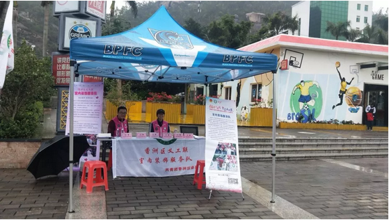 活動過程中,綿綿的小雨逐漸變大,可是這并沒有澆熄志愿者們服務(wù)的熱情,大家紛紛打起雨傘,轉(zhuǎn)移至遮蔽處,熱情地為有需要的市民朋友們提供服務(wù)。