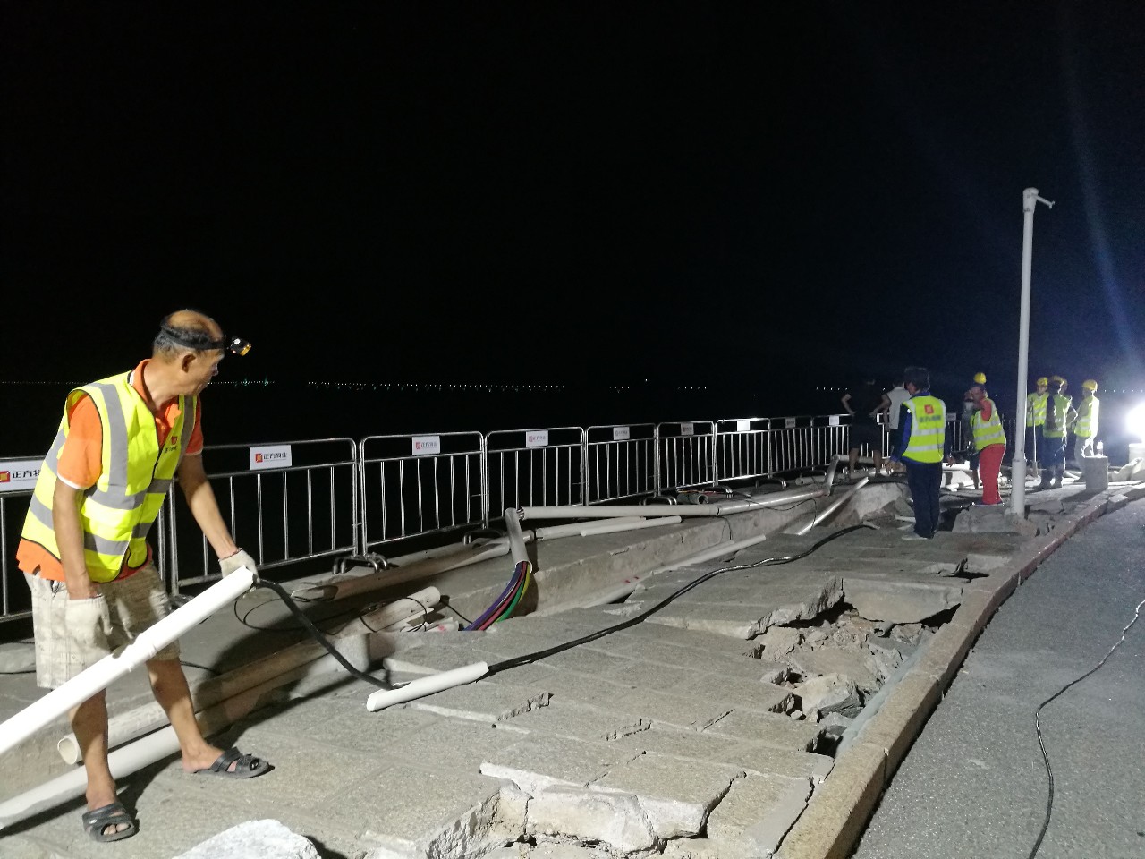 臺風(fēng)過境當(dāng)晚,正方城建公司迅速反應(yīng),連夜組織各部門員工前往受損嚴重的情侶路段進行搶修支援。彼時,“山竹”仍未完全退卻,狂風(fēng)暴雨里的海邊到處一片狼藉,受損路段仍未恢復(fù)通電。一片黑暗之中,他們卻組織有序地鋸木、鏟泥、清掃,即使身上的雨衣早已被雨水浸透,忙到連水都來不及喝一口,依然不停歇地與正方控股的應(yīng)急隊員堅守奮戰(zhàn)在災(zāi)后復(fù)產(chǎn)的第一線。