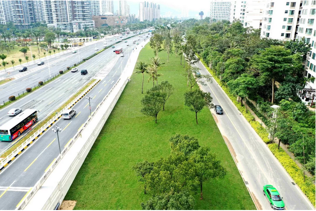 由于該路段原停車場地面植草磚鋪裝老舊,草種生長不佳,改造提升后,停車場地面將采用改性透水瀝青混凝土鋪地,干凈、美觀、整潔、耐用。而且,華發(fā)新城側(cè)綠帶緊挨機(jī)動(dòng)車道,缺少人行道系統(tǒng),存在交通安全隱患,升級(jí)連通后1.5m的人行道景觀與周邊環(huán)境相融合,將提高實(shí)用性以及美學(xué)情趣。此外,本次改造提升還將對(duì)園路進(jìn)行優(yōu)化,選擇幽靜的綠化及園路區(qū)域設(shè)成品景觀座椅。本次改造還將通過時(shí)花與草坪交替布置的形式,翻新種植大面積陽光草皮,增大市民的游憩空間,豐富中央綠化帶的景觀效果,實(shí)現(xiàn)沿線景觀可觀、可達(dá)、可憩。