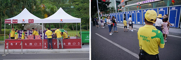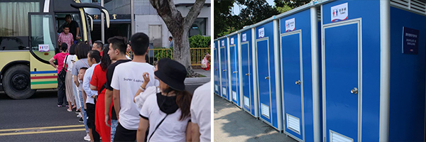 12時(shí),2臺(tái)車輛式移動(dòng)洗手間及100個(gè)立式移動(dòng)洗手間停放到指定位置,所有指示牌完成擺放……