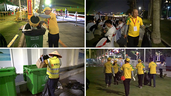 21時(shí),絢爛的焰火晚會(huì)在數(shù)萬(wàn)人的歡呼聲中落下帷幕,“小黃人”們組織觀眾有序退場(chǎng)。人群散去,“小黃人”們還不能回去,大家開始對(duì)各自負(fù)責(zé)區(qū)域進(jìn)行全面清潔,采取一字排開的方式展開掃蕩式垃圾清理、撤回臨時(shí)垃圾桶及洗手間,完成路面保潔,以確保當(dāng)晚還市民一條清潔美麗的情侶路……