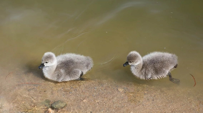 剛出殼的雛鳥毛色灰白色,幾天后即可下水游泳了,可與父母下水覓食,遇到驚擾,就躲到父母翼下。小天鵝三、四月齡毛色逐漸轉(zhuǎn)變成黑灰色,6月齡后具有與成年天鵝一樣的體型和體重了。