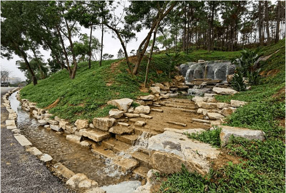針對(duì)公園內(nèi)原有的幾處地質(zhì)災(zāi)害點(diǎn)制定修復(fù)方案,在保證工程安全的前提下,進(jìn)行邊坡的修復(fù)處理,采用植物軟化過(guò)渡,使得山間景觀更加親近,游人也更能融入大自然。