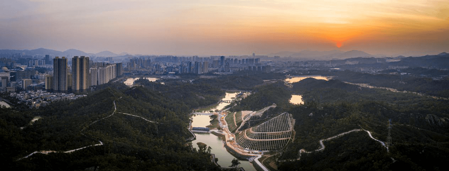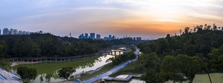 公園定位為嶺南園林建筑山水園,遵循“雖由人作,宛自天成”的主題,橋曲欄回、亭臺(tái)樓榭、貽水石橋、湖渡輝映,展現(xiàn)清雅秀麗的南國風(fēng)光,打造一個(gè)與生態(tài)風(fēng)貌相協(xié)調(diào),兼顧功能性、景觀性和藝術(shù)性的國際化高水平低碳休閑城市公園。