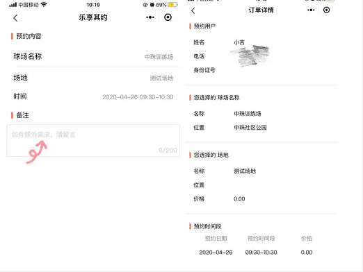 點擊【選擇確認(rèn)】之后,可以填寫想要備注的信息;確認(rèn)之后,進入訂單詳情,會有【預(yù)定編號】、【預(yù)定時間段】等信息;返回小程序主頁面,點擊【我的預(yù)約】可隨時查詢訂單信息。
