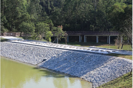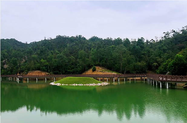 繼續(xù)前行,跌水廊橋橫跨于湖面,坐落在原有的堤壩之上,連接對面的登山步道。游客登山下來經過此處,可坐在廊橋兩側乘涼吹風,觀看湖景,好不愜意。