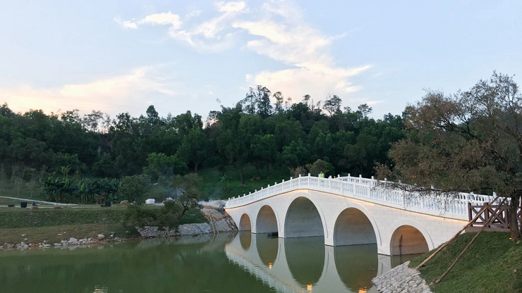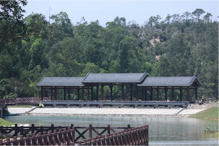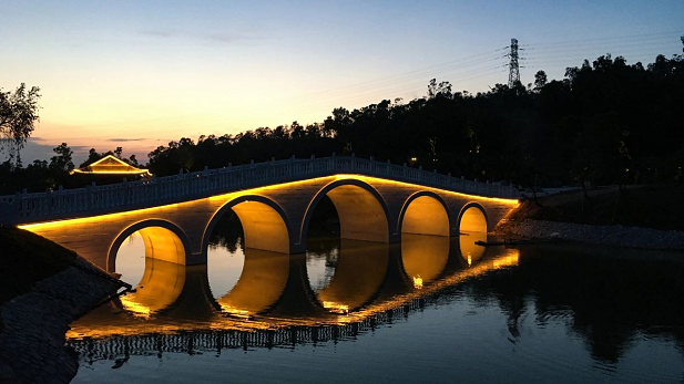 往前走可通過開闊的湖面,遠觀嶺南風格景觀的月門、水榭、五孔橋,月門將瀲滟湖水與青蔥山林優(yōu)美分割,形成極簡的禪意味。