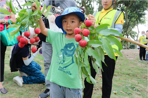 在工作人員的配合幫助下,荔枝林不時傳來小朋友和家長們采摘到荔枝的歡呼聲。