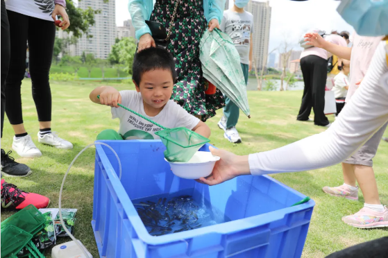 “一條、兩條、三條,成功啦!”在最后的解救“波妞“環(huán)節(jié),競爭異常激烈,小朋友和家長一起拿著小網(wǎng)兜,在魚池中小心翼翼地網(wǎng)起小魚。