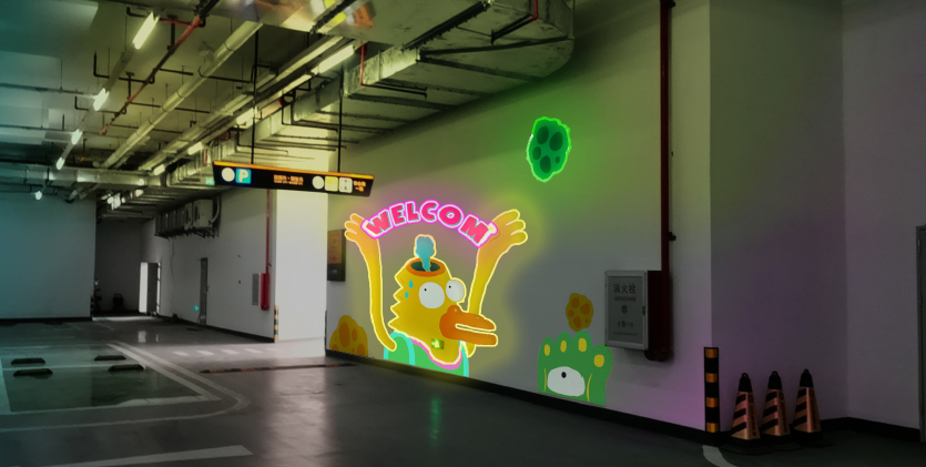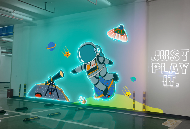場內(nèi)一共繪制了7組壁畫,高度近4米。更別致的是,壁畫以外還加裝了霓虹燈帶,提升了壁畫的視覺沖擊力,搞怪有趣,十分可愛。