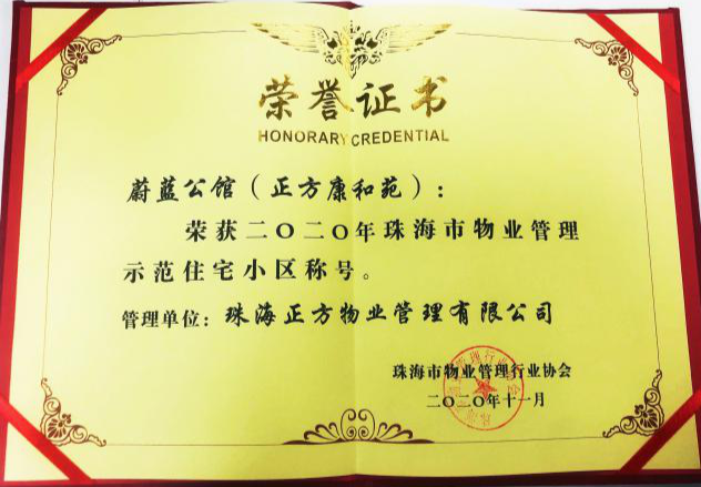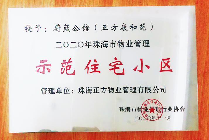 珠海市物業(yè)管理示范項目驗收組經(jīng)過多次現(xiàn)場專項檢查并定期進行抽查,蔚藍公館(正方康和苑)在11月13日榮獲“2020年珠海市物業(yè)管理示范項目”榮譽稱號。