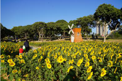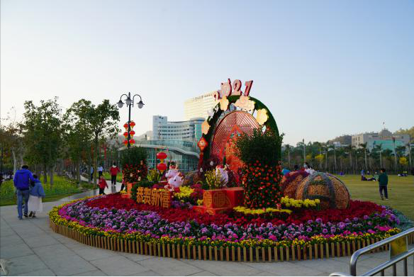 海天公園正門(mén)廣場(chǎng)的“時(shí)來(lái)運(yùn)轉(zhuǎn)過(guò)潮年”、南門(mén)門(mén)樓的“牛轉(zhuǎn)乾坤福滿門(mén)”以紅色為主題,將新春與廣府、海洋、鮮花等融合,展現(xiàn)珠海城市的浪漫、青春、活力,樹(shù)梢上一串串大紅燈籠,飽含著新春的喜慶與祝福,繽紛的茶花、熱烈的勒杜鵑、絢麗的波斯菊、金黃的油菜花……在溫潤(rùn)的海風(fēng)中,享受宜人美景。