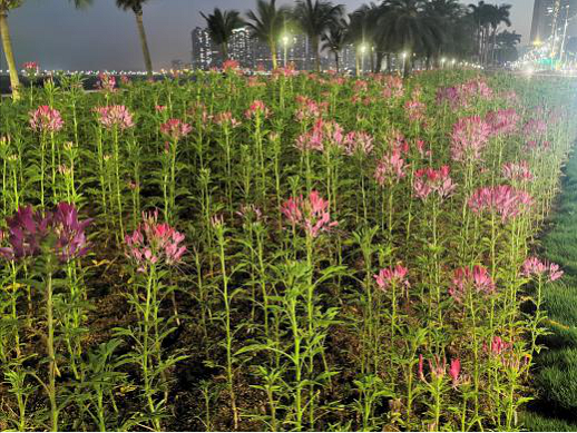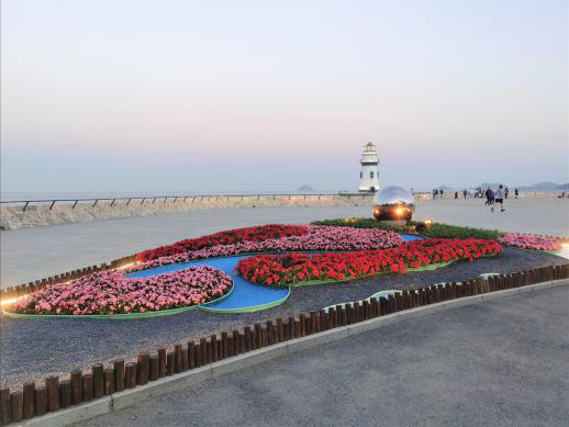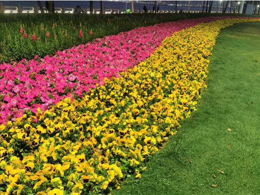 湛藍(lán)天空下、碧綠海浪旁、旖旎海風(fēng)間,一串紅、波斯菊、醉蝶、金魚(yú)草、三色堇……將情侶路這條飄逸的綢帶裝點(diǎn)得更加浪漫動(dòng)人。
