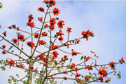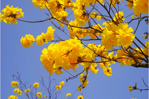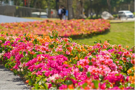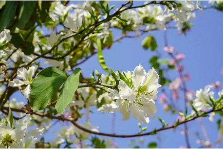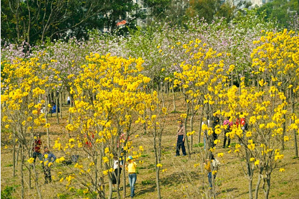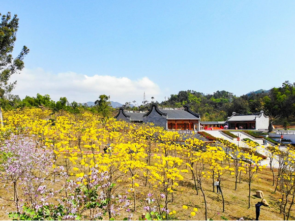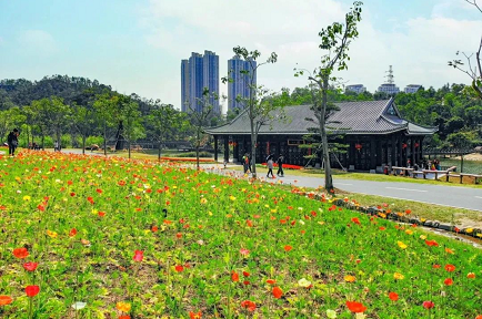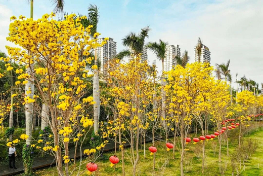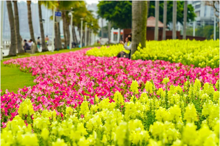 在輕柔的海風(fēng)中,海天公園仿佛一幅絢爛的油畫(huà),木棉吐出了花蕊,宮粉紫荊露出了紅粉,茶花、勒杜鵑競(jìng)相盛放,黃花風(fēng)鈴木花團(tuán)錦簇,嬌艷如繁星般點(diǎn)綴整個(gè)公園。