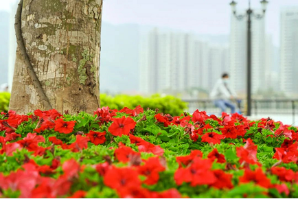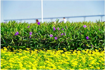 春光燦爛,如詩(shī)如畫(huà),一串紅、一串紫、醉碟、三色瑾、孔雀草、波斯菊,裝點(diǎn)在情侶路這條碧綠絲帶上。