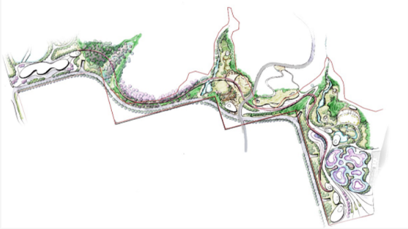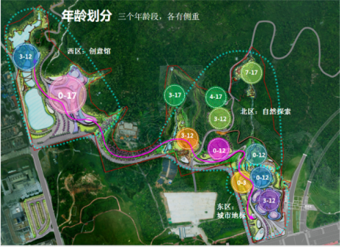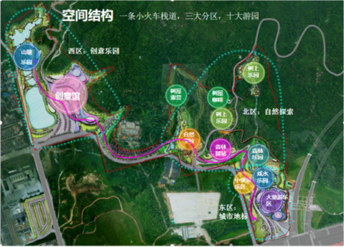 項(xiàng)目結(jié)合城、園、山、溪、林的地域特點(diǎn),利用原有地形,根據(jù)不同年齡段兒童的需求,以“自然生態(tài)、科普教育、親子運(yùn)動(dòng)”為主題,建設(shè)西區(qū)創(chuàng)意樂園、北區(qū)自然探索、東區(qū)城市地標(biāo)三大分區(qū),分散布局10個(gè)適合不同年齡段兒童游玩的游戲島,市民游客可通過一列小火車貫穿其中,沿途設(shè)置車站站點(diǎn),形成一條便捷的動(dòng)態(tài)交通流線。