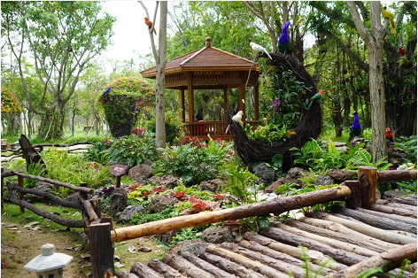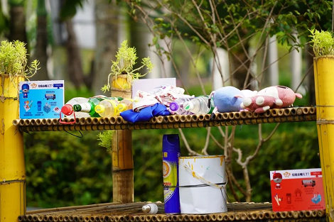 作品描述:該作品以輪胎、油桶、臺風枯枝、廢棄PVC水管、修剪剩下的竹子等破舊廢料為主要材料,通過刷漆加工彩繪,再用時花、植物點綴,營造出特色主題小景,不僅可以美化景觀,還起到了科普垃圾分類,引導(dǎo)市民提高環(huán)保意識的作用。