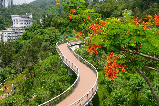 雞公山示范段位于情侶中路海天公園南側(cè),是繼香山湖示范段后,項(xiàng)目建成的又一重要節(jié)點(diǎn)工程。棧道全長1100米,沿雞公山段蜿蜒而上,將整個山體延展開來,形成山海相望,海天成趣的景象。云道與海天公園、珠海市博物館相鄰,還有海天公園停車場,為市民游客提供便利。