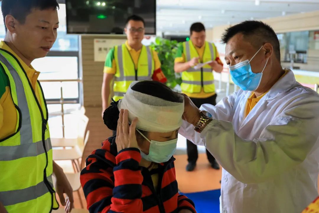 11時09分,演練準(zhǔn)時開始,演練現(xiàn)場由安全專員點燃煙霧彈觸發(fā)煙感報警器報警。監(jiān)控中心接到報警信號后立即安排巡邏崗到報警地點查看,確認(rèn)后向監(jiān)控中心匯報,隨后進(jìn)行受傷人員緊急救治演練。