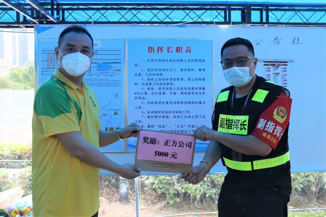 4月22日上午,在珠海南屏收費站防疫檢查指揮部,正方集團副總經理凌安代表正方現代服務公司,接受防疫指揮部代表香洲區(qū)南屏鎮(zhèn)政府頒發(fā)的表彰,獎勵正方現代服志愿者在南屏防疫檢查工作中高效排查并及時協(xié)助處理一名入珠抗原檢測異常旅客,斬斷疫情傳播風險的出色表現。