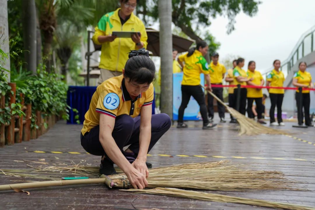 保潔組競(jìng)賽分“自我形象展示”、“知識(shí)必答”、“實(shí)操演示”三個(gè)環(huán)節(jié)進(jìn)行。6組隊(duì)伍在進(jìn)行風(fēng)采展示后,展開(kāi)了激烈的知識(shí)問(wèn)答比拼。面對(duì)清潔劑配比、不同擦拭布與清潔劑的使用場(chǎng)景等提問(wèn),參賽選手應(yīng)對(duì)自如,從容作答。實(shí)操環(huán)節(jié)中,選手們展示了刮拭玻璃、拖掃落葉、編制大掃把等技能,表現(xiàn)出了優(yōu)秀的專業(yè)技能水平。
