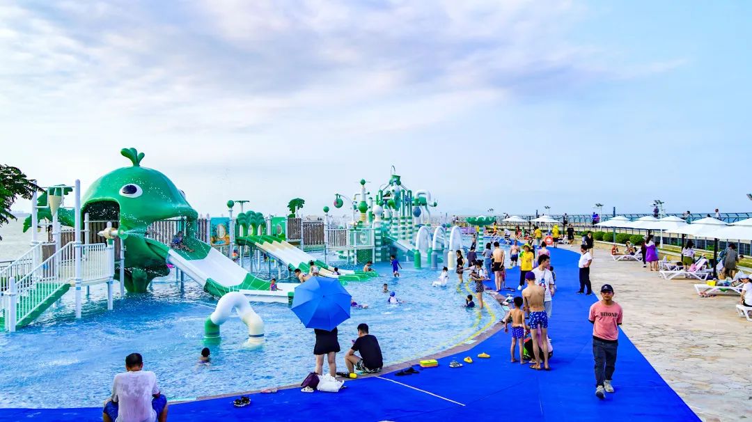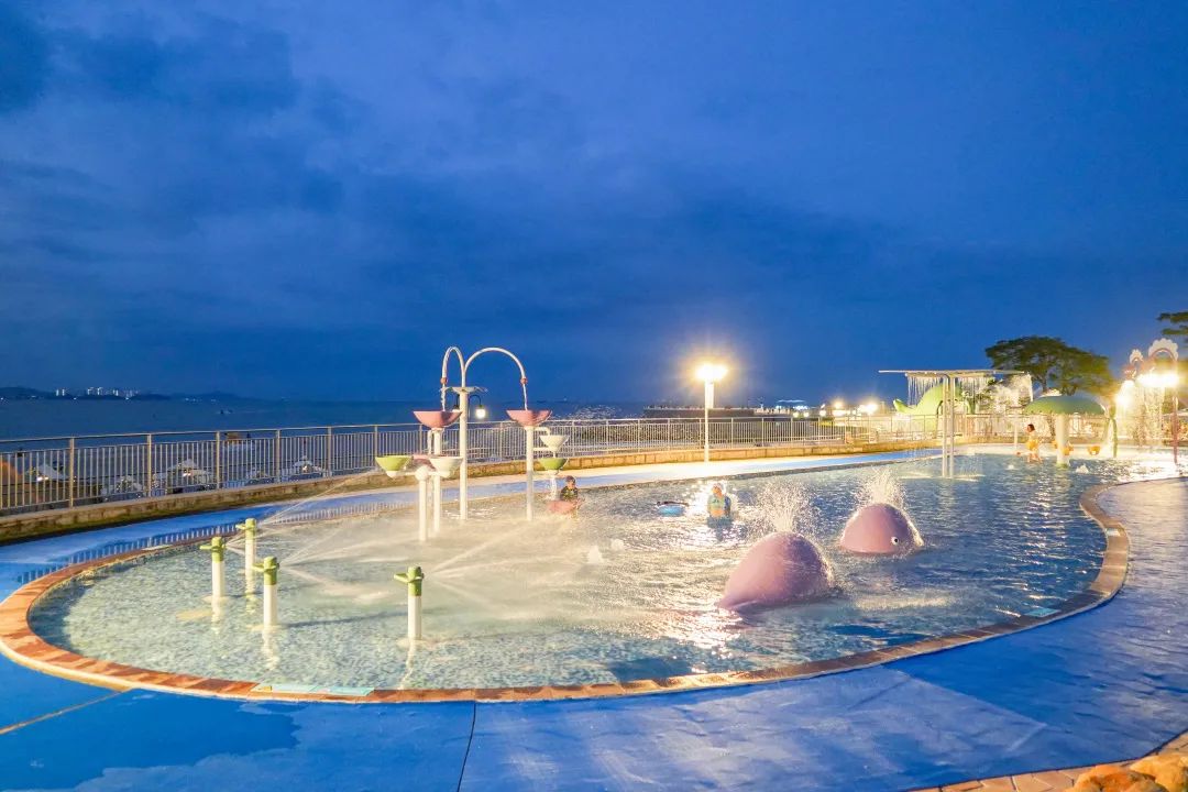 摩爾紋水寨,蘑菇傘、麻花、向陽花、花果樹以及長(zhǎng)頸鹿、青蛙、鯨魚等十幾種造型各異、充滿童真童趣的戲水設(shè)備,10余條滑梯滑道,幾十處噴水、疊水等設(shè)施,搭配夜晚泛光照明系統(tǒng)。在碧海藍(lán)天下,打造無敵海景水上親子樂園,解鎖水上全新玩法。熱浪灣·水樂園將成為情侶路又一個(gè)遛娃打卡點(diǎn)。