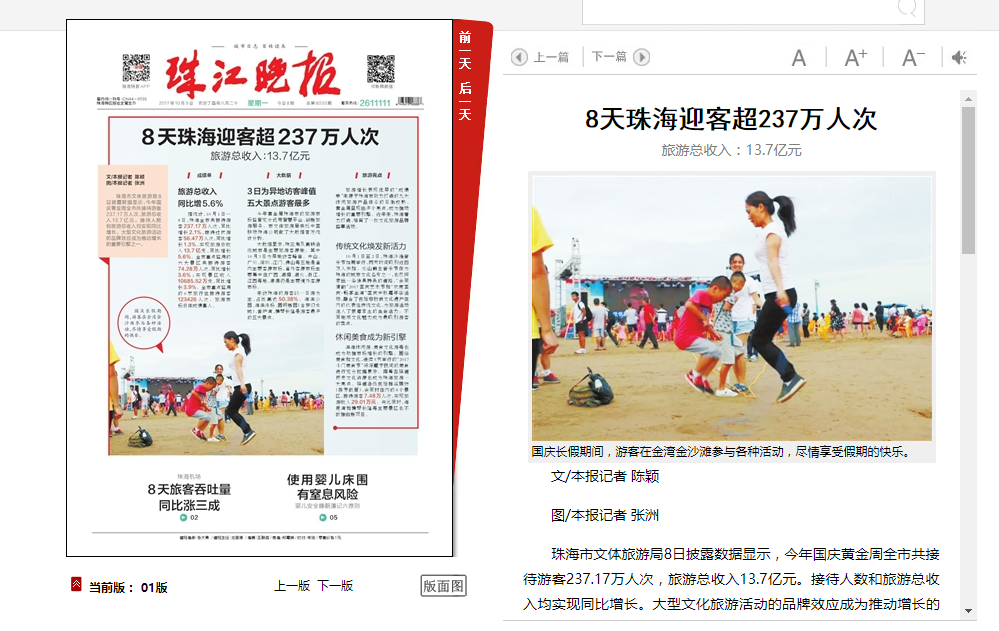 據(jù)統(tǒng)計(jì),10月1日—8日,珠海全市共接待游客237.17萬人次,同比增長2.1%,接待過夜游客56.47萬人次,同比增長1.3%,實(shí)現(xiàn)旅游總收入13.7億元,同比增長5.6%。全市重點(diǎn)監(jiān)測的六大景區(qū)共接待游客74.28萬人次,同比增長3.6%;實(shí)現(xiàn)景區(qū)收入10685.52萬元,同比增長3.9%。全市重點(diǎn)監(jiān)測的6家旅行社接待游客123426人次。旅游市場總體成績喜人。
