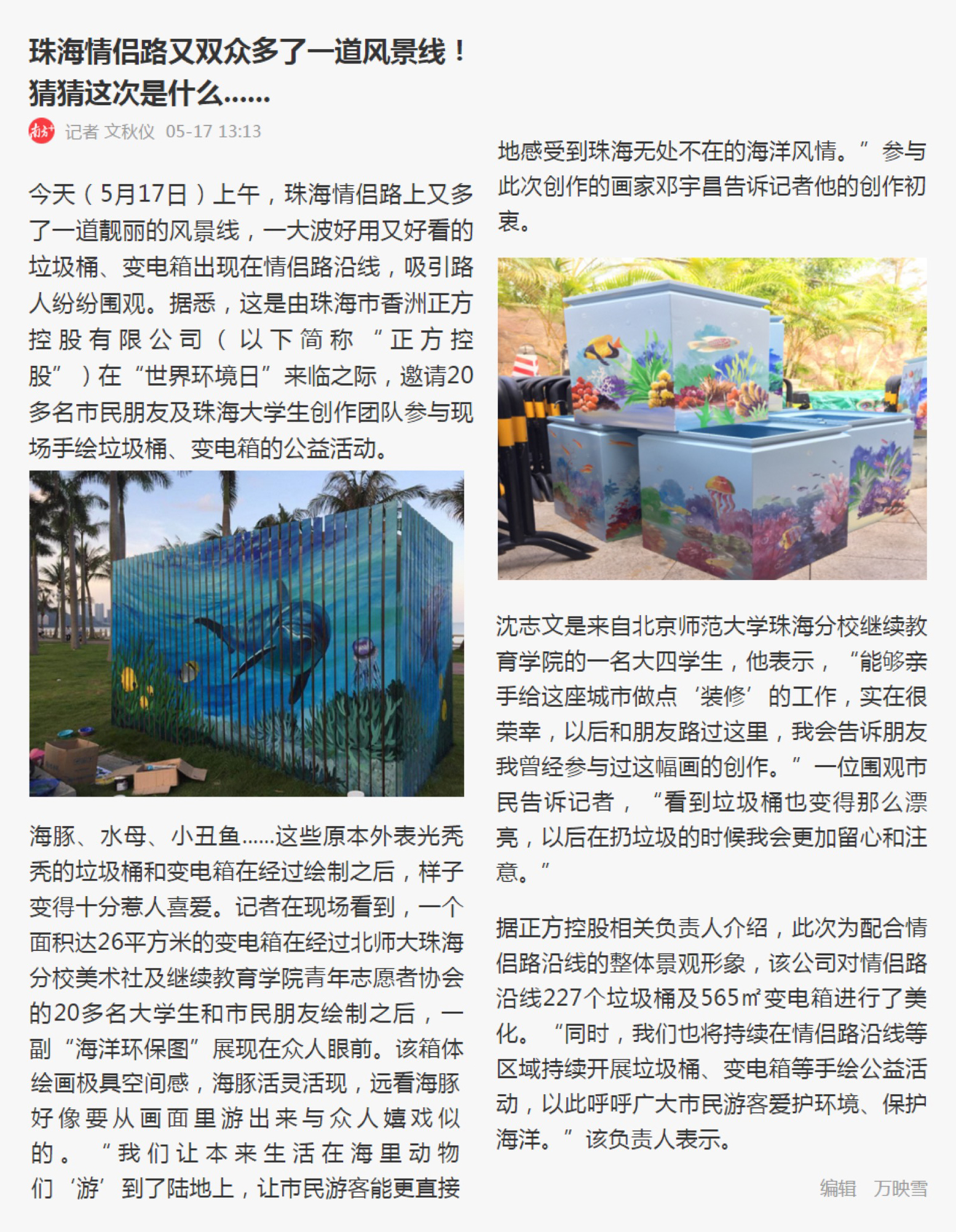 今天(5月17日)上午,珠海情侶路上又多了一道靚麗的風(fēng)景線,一大波好用又好看的垃圾桶、變電箱出現(xiàn)在情侶路沿線,吸引路人紛紛圍觀。據(jù)悉,這是由珠海市香洲正方控股有限公司(以下簡稱“正方控股”)在“世界環(huán)境日”來臨之際,邀請20多名市民朋友及珠海大學(xué)生創(chuàng)作團(tuán)隊參與現(xiàn)場手繪垃圾桶、變電箱的公益活動。
