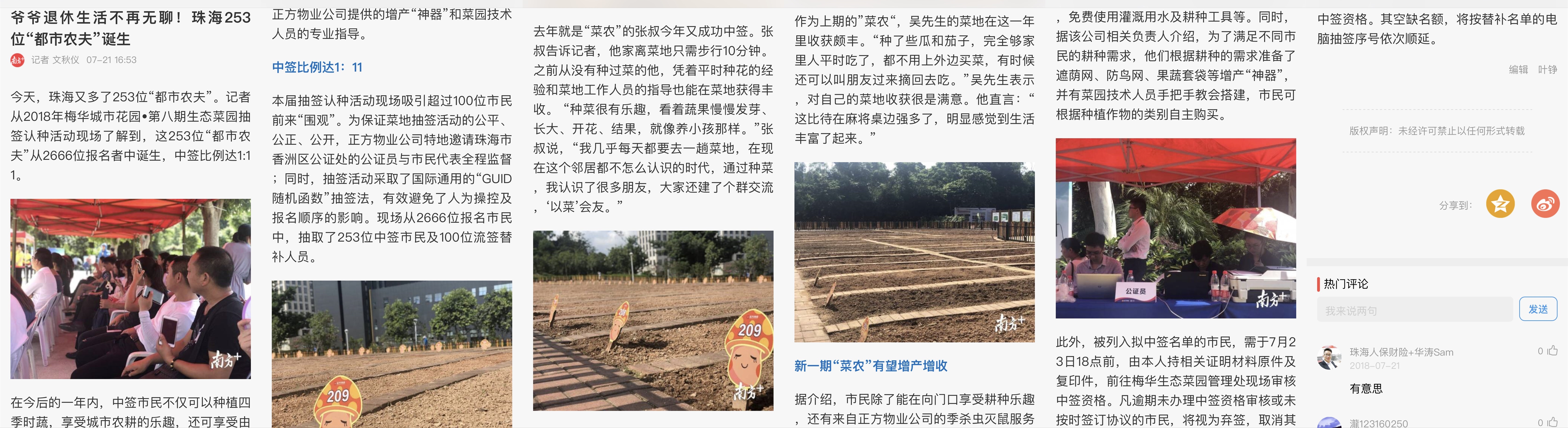 本屆抽簽認(rèn)種活動(dòng)現(xiàn)場(chǎng)吸引超過(guò)100位市民前來(lái)“圍觀”。為保證菜地抽簽活動(dòng)的公平、公正、公開(kāi),正方物業(yè)公司特地邀請(qǐng)珠海市香洲區(qū)公證處的公證員與市民代表全程監(jiān)督;同時(shí),抽簽活動(dòng)采取了國(guó)際通用的“GUID隨機(jī)函數(shù)”抽簽法,有效避免了人為操控及報(bào)名順序的影響。現(xiàn)場(chǎng)從2666位報(bào)名市民中,抽取了253位中簽市民及100位流簽替補(bǔ)人員。去年就是“菜農(nóng)”的張叔今年又成功中簽。張叔告訴記者,他家離菜地只需步行10分鐘。之前從沒(méi)有種過(guò)菜的他,憑著平時(shí)種花的經(jīng)驗(yàn)和菜地工作人員的指導(dǎo)也能在菜地獲得豐收。 “種菜很有樂(lè)趣,看著蔬果慢慢發(fā)芽、長(zhǎng)大、開(kāi)花、結(jié)果,就像養(yǎng)小孩那樣。”張叔說(shuō),“我?guī)缀趺刻於家ヒ惶瞬说?,在現(xiàn)在這個(gè)鄰居都不怎么認(rèn)識(shí)的時(shí)代,通過(guò)種菜,我認(rèn)識(shí)了很多朋友,大家還建了個(gè)群交流,‘以菜’會(huì)友。”