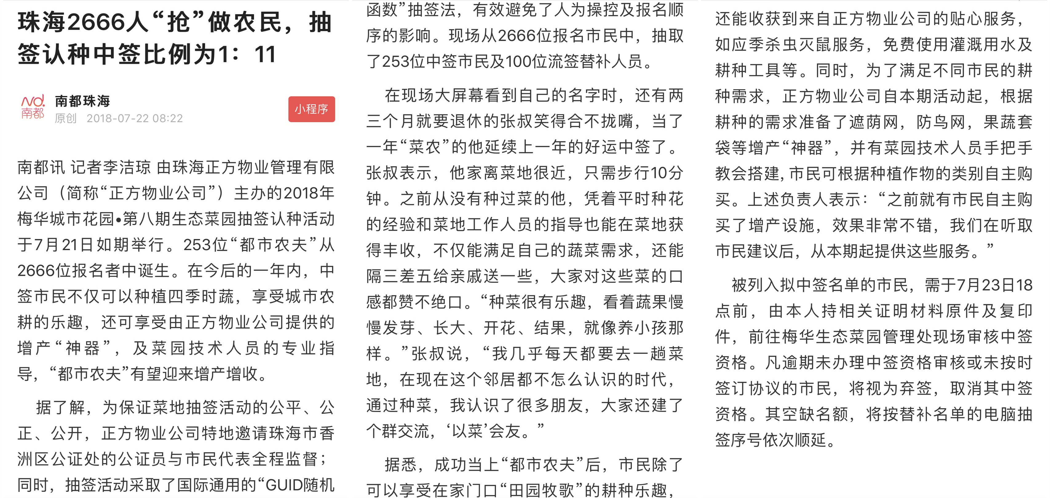 據了解,為保證菜地抽簽活動的公平、公正、公開,正方物業(yè)公司特地邀請珠海市香洲區(qū)公證處的公證員與市民代表全程監(jiān)督;同時,抽簽活動采取了國際通用的“GUID隨機函數”抽簽法,有效避免了人為操控及報名順序的影響?,F場從2666位報名市民中,抽取了253位中簽市民及100位流簽替補人員。