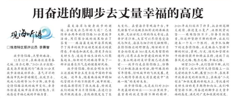 回望2020年,我們堅(jiān)持不懈,我們奮力前行,就如同昨天情侶路上一往無(wú)前的徒步人群;展望2021年,在改革開放再出發(fā)的新征程上,在珠?!岸蝿?chuàng)業(yè)”加快發(fā)展的新起點(diǎn)上,寄托著對(duì)美好生活的更多期待和向往,我們唯有堅(jiān)持不懈,用奮進(jìn)的腳步去丈量幸福的高度、滿足的廣度和收獲的深度。