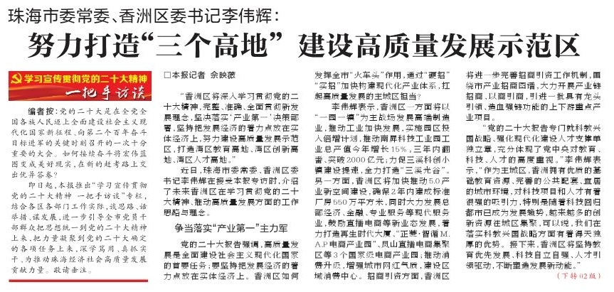 “香洲區(qū)將深入學習貫徹黨的二十大精神,完整、準確、全面貫徹新發(fā)展理念,堅決落實‘產(chǎn)業(yè)第一’決策部署,堅持把發(fā)展經(jīng)濟的著力點放在實體經(jīng)濟上,努力建設(shè)高質(zhì)量發(fā)展示范區(qū),打造灣區(qū)教育高地、灣區(qū)創(chuàng)新高地、灣區(qū)人才高地?!?