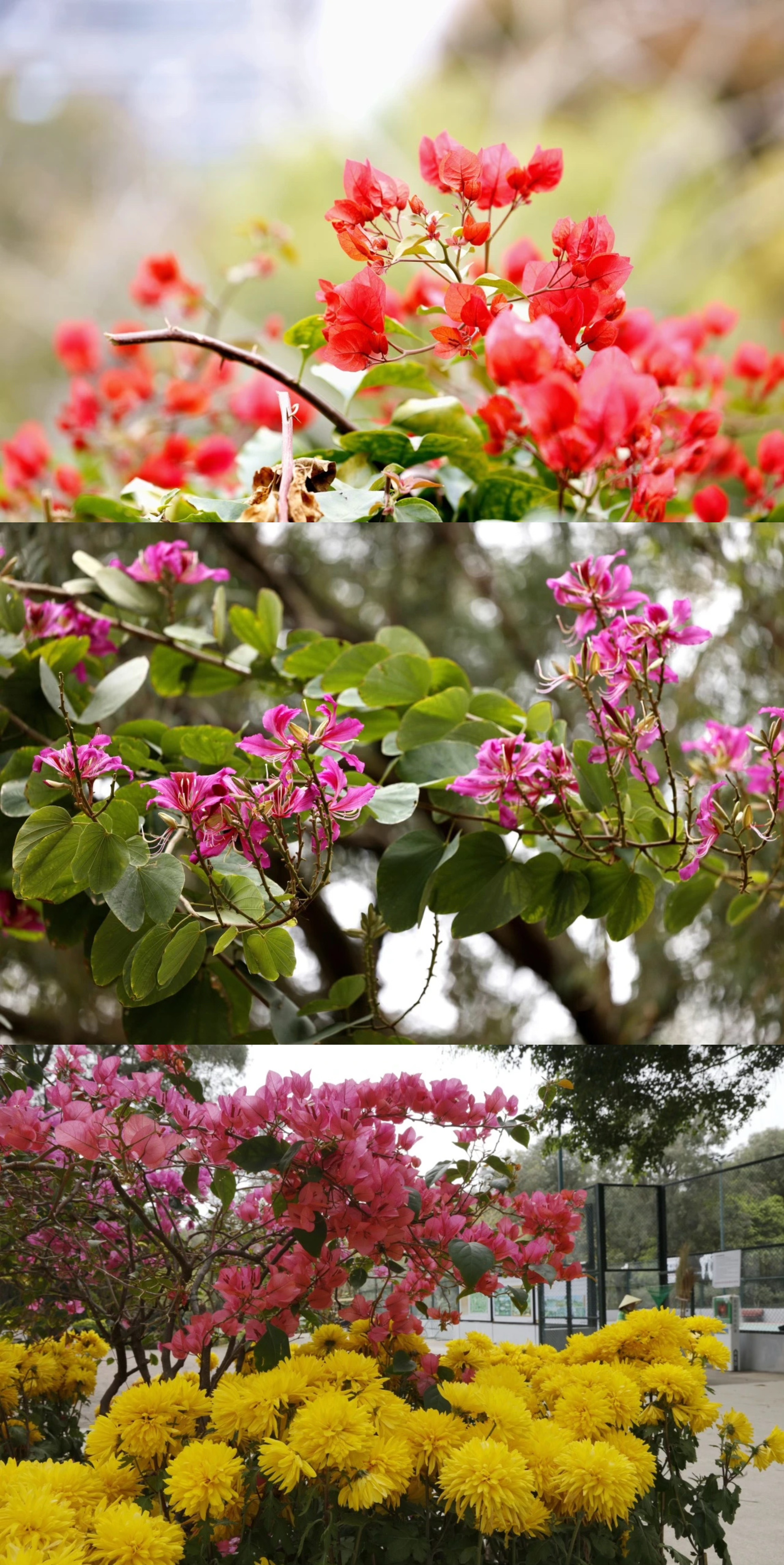 炮仗花、紅花紫荊、宮粉紫荊、木棉、火焰木、勒杜鵑、鳳凰木、黃槐、紫羅蘭……有的正值花期,有的含苞待放,盎然的春意將公園點(diǎn)綴得五彩斑斕。