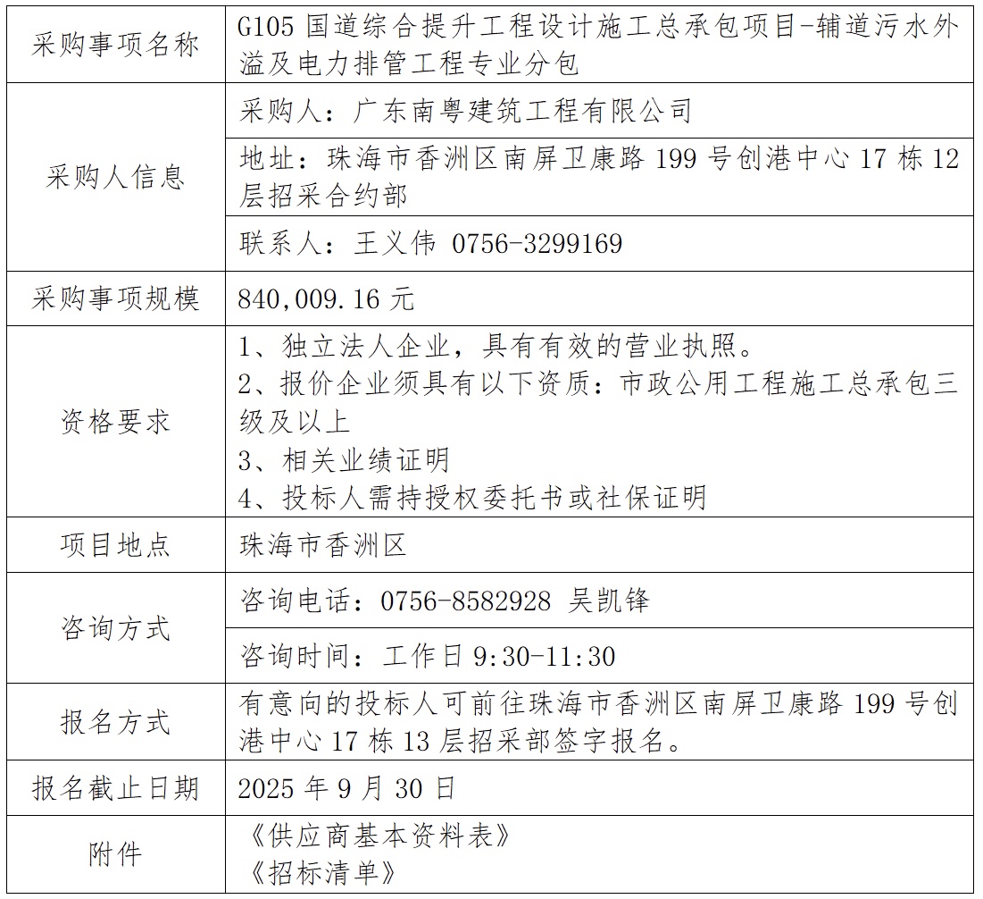 G105國(guó)道綜合提升工程設(shè)計(jì)施工總承包項(xiàng)目-輔道污水外溢及電力排管工程專(zhuān)業(yè)分包 專(zhuān)欄:工程招標(biāo) 發(fā)布日期: 2025-09-25 作者:招采管理中心 附件:供應(yīng)商基本資料表 附件:G105國(guó)道綜合提升工程設(shè)計(jì)施工總承包項(xiàng)目-輔道污水外溢及電力排管工程專(zhuān)業(yè)分包-招標(biāo)清單 返回列表 上一篇:鳳凰山山地步道項(xiàng)目(香山湖公園至海天公園段)-全線(xiàn)整改、維修工程專(zhuān)業(yè)分包 下一篇:三溪科創(chuàng)小鎮(zhèn)二期道路-智慧路燈照明工程整改移交專(zhuān)業(yè)分包(延期公示)