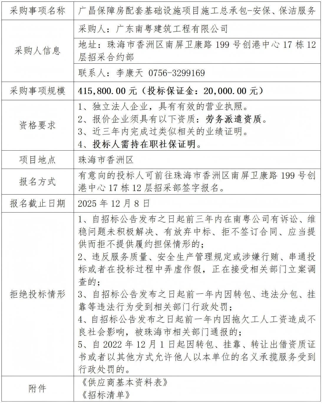 廣昌保障房配套基礎(chǔ)設(shè)施項目施工總承包-安保、保潔服務(wù) 專欄:工程招標(biāo) 發(fā)布日期: 2025-12-02 作者:招采管理中心 附件:供應(yīng)商基本資料表 附件:廣昌保障房配套基礎(chǔ)設(shè)施項目施工總承包-安保、保潔服務(wù)- 空白清單 返回列表 上一篇:廣昌保障房配套基礎(chǔ)設(shè)施項目施工總承包--土建勞務(wù)分包(均昌路+廣灣街) 下一篇:廣昌保障房配套基礎(chǔ)設(shè)施項目施工總承包-食堂服務(wù)