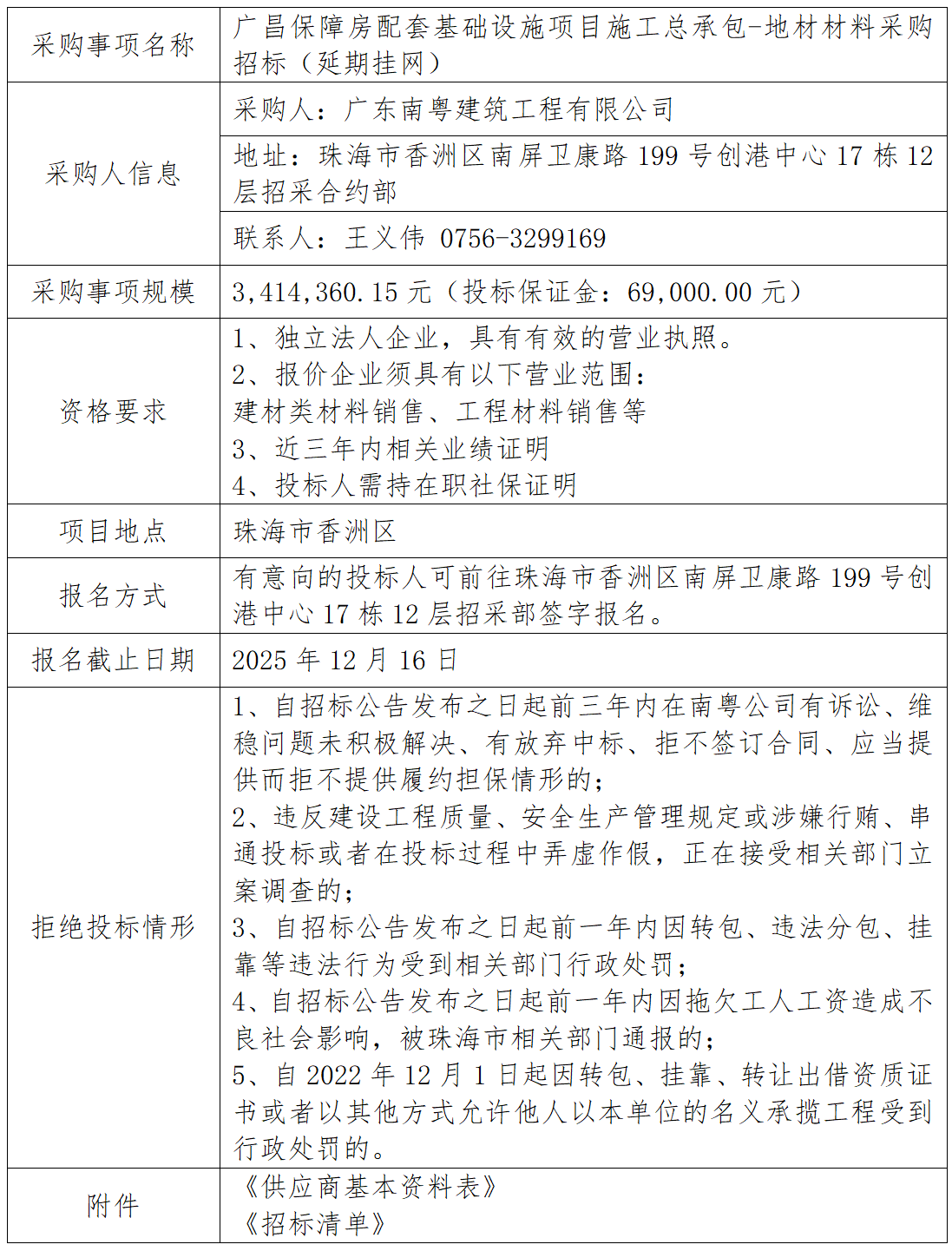 廣昌保障房配套基礎(chǔ)設(shè)施項(xiàng)目施工總承包-地材材料采購(gòu)招標(biāo)(延期掛網(wǎng)) 專(zhuān)欄:工程招標(biāo) 發(fā)布日期: 2025-12-11 作者:招采管理中心 附件:供應(yīng)商基本資料表 附件:廣昌保障房配套基礎(chǔ)設(shè)施項(xiàng)目施工總承包-地材材料采購(gòu)招標(biāo)清單 返回列表 上一篇:廣昌保障房配套基礎(chǔ)設(shè)施項(xiàng)目施工總承包-混凝土材料采購(gòu)(預(yù)算、稅率變更) 下一篇:廣昌保障房配套基礎(chǔ)設(shè)施項(xiàng)目施工總承包-鋼管租賃服務(wù)