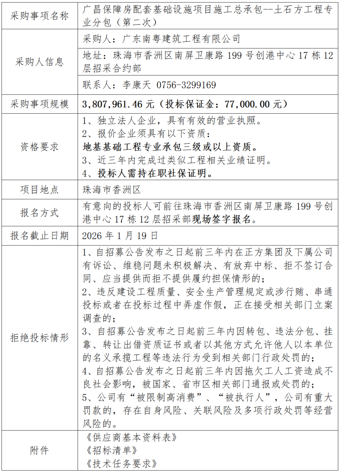 廣昌保障房配套基礎設施項目施工總承包--土石方工程專業(yè)分包(第二次) 專欄:工程招標 發(fā)布日期: 2026-01-13 作者:招采管理中心 附件:供應商基本資料表 附件:土石方專業(yè)分包招標預算價清單 - 空白清單 附件:招標技術要求(土石方工程)20260113 返回列表 上一篇:廣昌保障房配套基礎設施項目施工總承包-模板材料采購(延期公示) 下一篇:廣昌保障房配套基礎設施項目施工總承包-食堂服務(第二次)